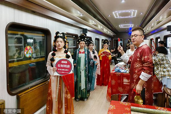 2023年9月9日,西安市,旅客们穿汉唐服饰在车厢内拍照留念。