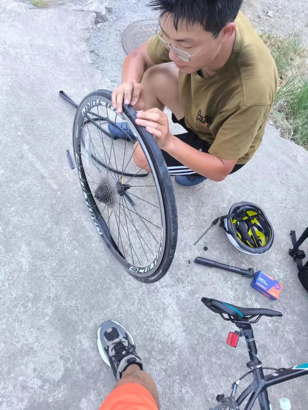 骑行途中,罗词文修补爆掉的车胎。 蔡凯供图