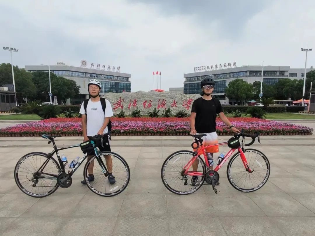骑行400公里后,罗词文(左)和蔡凯(右)顺利到达武汉纺织大学。 蔡凯供图
