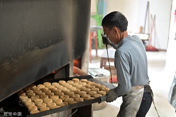 2023年9月13日,湖南省娄底市,双峰县走马街镇一家柴火月饼加工坊,工人从柴火灶内取出月饼。