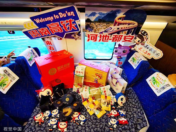 2023年8月31日,广西河池,贵南高铁首趟复兴号动车组上展示的都安瑶乡土特产品。