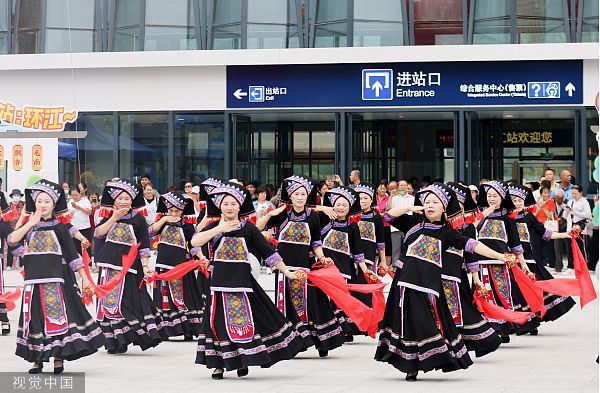 2023年8月31日,广西河池,环江毛南族自治县各族群众在环江站载歌载舞喜庆高铁通车。