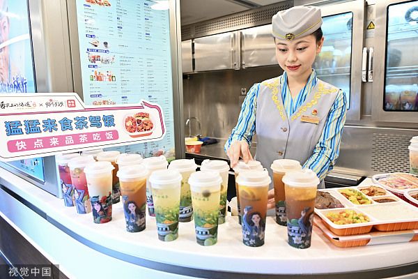 2023年9月13日,广州,广汕高铁试运行列车上为乘客准备的特色饮品。广汕高铁西起广州新塘站,途经广州、惠州、深汕特别合作区、汕尾4个市区,东至汕尾站。线路全长202公里,设计时速350公里,共设新塘、增城、罗浮山、博罗、惠州南、惠东、深汕、汕尾8座车站。项目开通运营后,广州至汕尾的高铁列车最短运行时间将由目前的2小时压缩至1小时以内。 中新社记者 陈骥旻 摄
