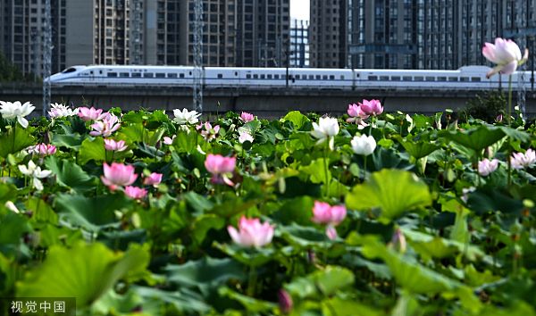 2023年8月28日,江苏昆山,沪宁城际铁路南,高新区渔戏莲叶南大片太空莲花开结莲,荷田、高楼与驶过的高铁相映成景,构成一幅美丽的生态画卷。