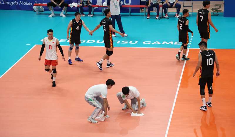7月31日,成都大运会一场男子排球比赛中的“快擦手”志愿者。中青报·中青网记者 王鑫昕/摄
