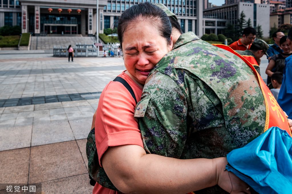 2023年9月16日,重庆,荣昌区举行2023年秋季新兵入伍欢送仪式,新兵家人为入伍军人送行。