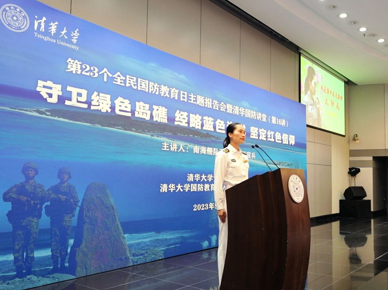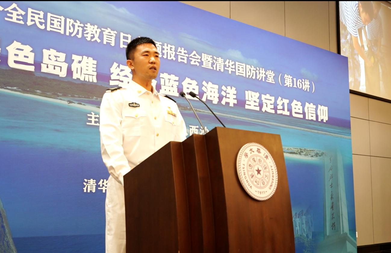 当天正值我国第23个全民国防教育日,团北京市委组织来自祖国南海的优秀“天涯哨兵”代表及其父母前往清华大学,开展了一场以“守卫绿色岛礁 经略蓝色海洋 坚定红色信仰”为主题的宣讲报告会。