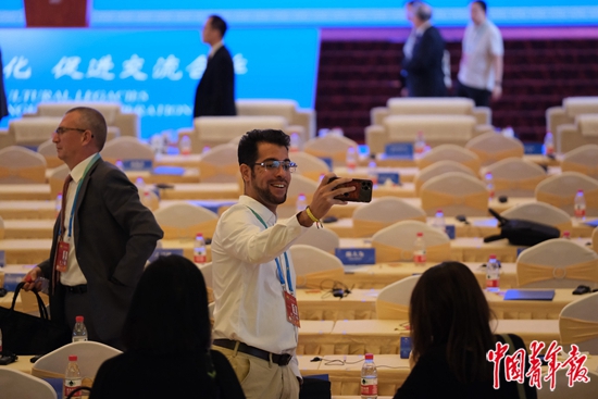 9月14日,北京,2023北京文化论坛盛大开幕。上午主论坛结束后,一名外国嘉宾在论坛现场自拍。中青报·中青网见习记者 田嘉硕/摄