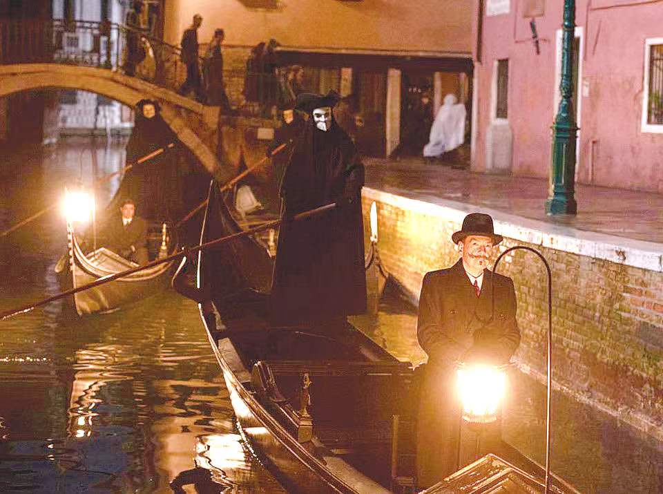 布拉纳显然不满足于阿加莎原作的“清淡”,他要突出传奇感,渲染跌宕的戏剧性,于是用华丽的威尼斯替代了伦敦近郊的无名小镇。确切说,布拉纳改编的阿加莎系列——《东方快车谋杀案》《尼罗河上的惨案》和这部《威尼斯惊魂夜》,这些电影何止“不响”,简直“太响”。