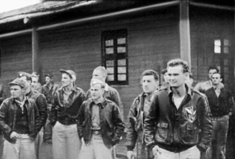 二战期间拍摄的“飞虎队”飞行员格伦·本尼达(前右一)和战友们在一起的资料照片。新华社发