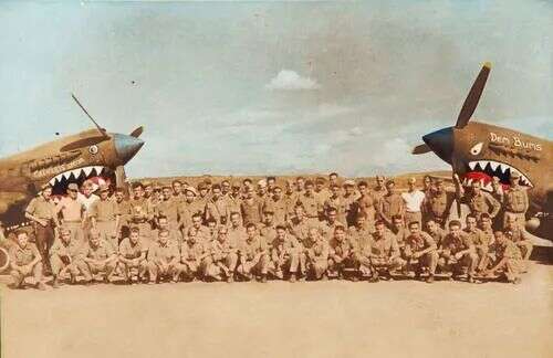 在二战期间的中国,美国第14航空军第23战斗团第76中队成员在两架涂着“鲨鱼嘴”标志的“飞虎队”战斗机前合影(资料照片)。新华社发