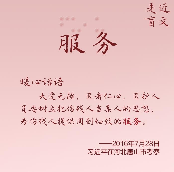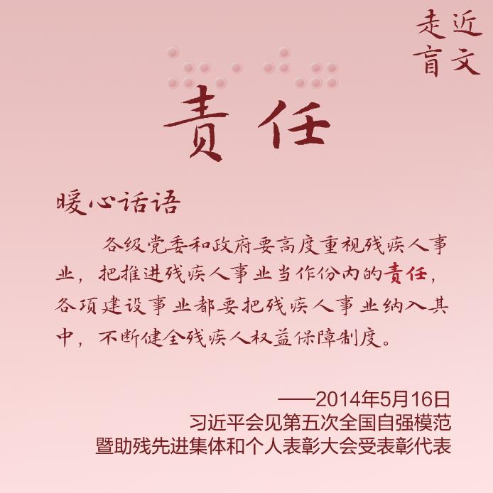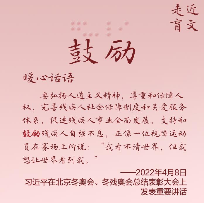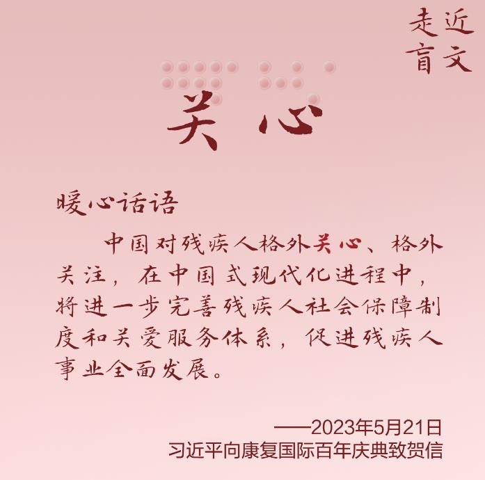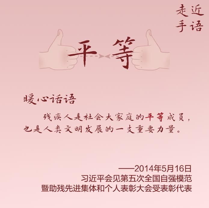 习近平总书记格外关心、格外关注残疾人群体,谆谆嘱托和殷殷期许,温暖而又鼓舞人心。让我们通过一组特殊的“文字”和“语言”,走近残疾人朋友,读懂总书记的深切关爱。