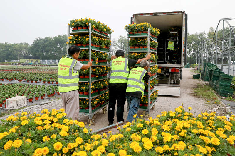 工作人员准备花卉。北京市园林绿化局供图