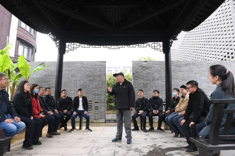 浙江绍兴诸暨市枫桥镇魏廉村老党员魏杏根(中)在枫桥经验陈列馆的亭子内和年轻党员分享当年运用“枫桥经验”化解基层矛盾的故事(2021年4月11日摄)。