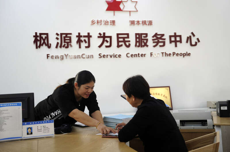 在浙江绍兴诸暨市枫桥镇枫源村,工作人员(左)在为民服务中心为村民办理事务(2020年10月31日摄)。