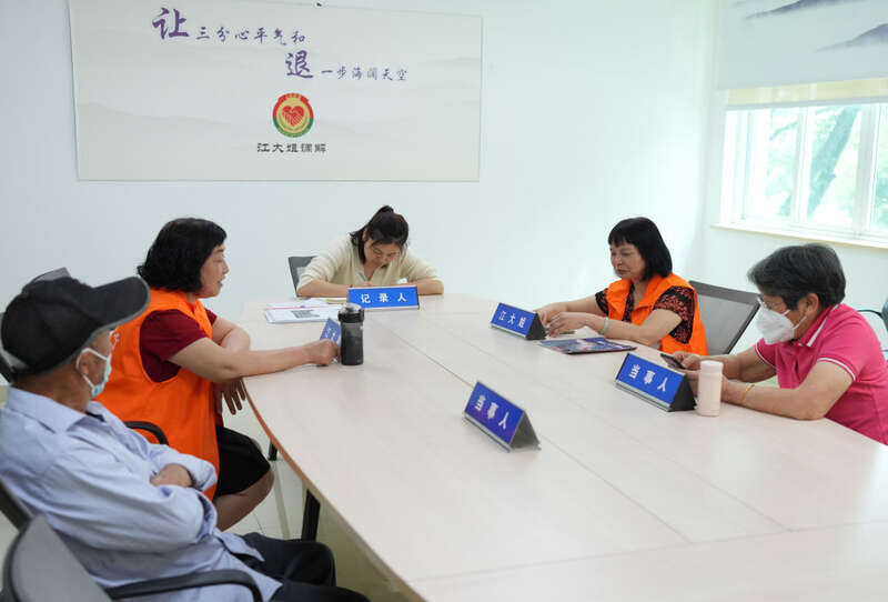 在浙江绍兴诸暨市暨阳街道江新社区“江大姐”调解室,两名调解员在为群众进行调解。这个调解工作室成员主要由女性组成,为周边居民调解邻里、家庭矛盾(2023年5月26日摄)。