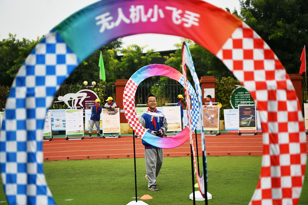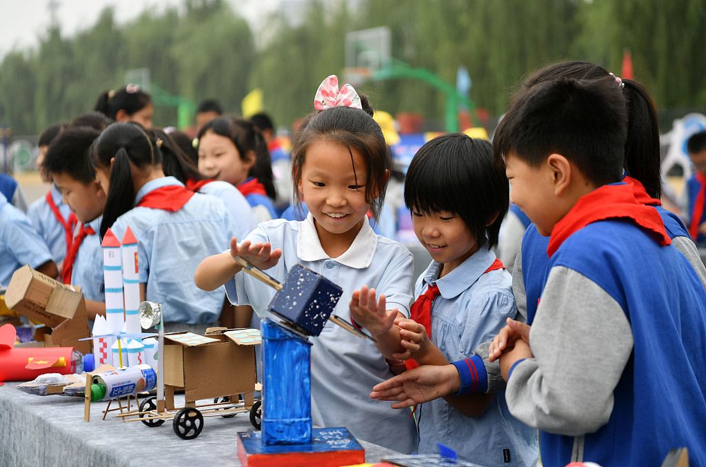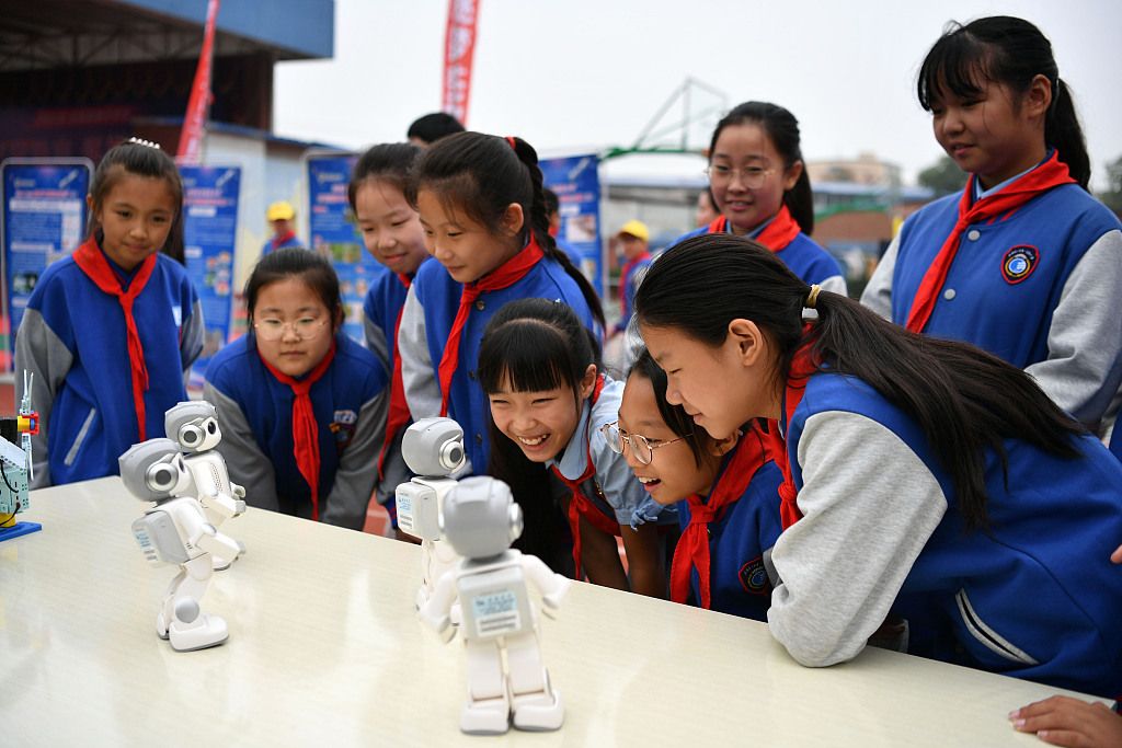 9月26日,石家庄,学生们被跳舞机器人吸引。当日,以“少年宏远志 筑梦苍穹行”为主题的校园航空航天博览会在栾城区宏远路小学举行。活动现场,学生们通过纸飞机飞行赛、航空航天模型展、无人机障碍赛等多种形式,在科普体验互动中感受科技魅力,提升科学素养。 中新社记者 翟羽佳 摄