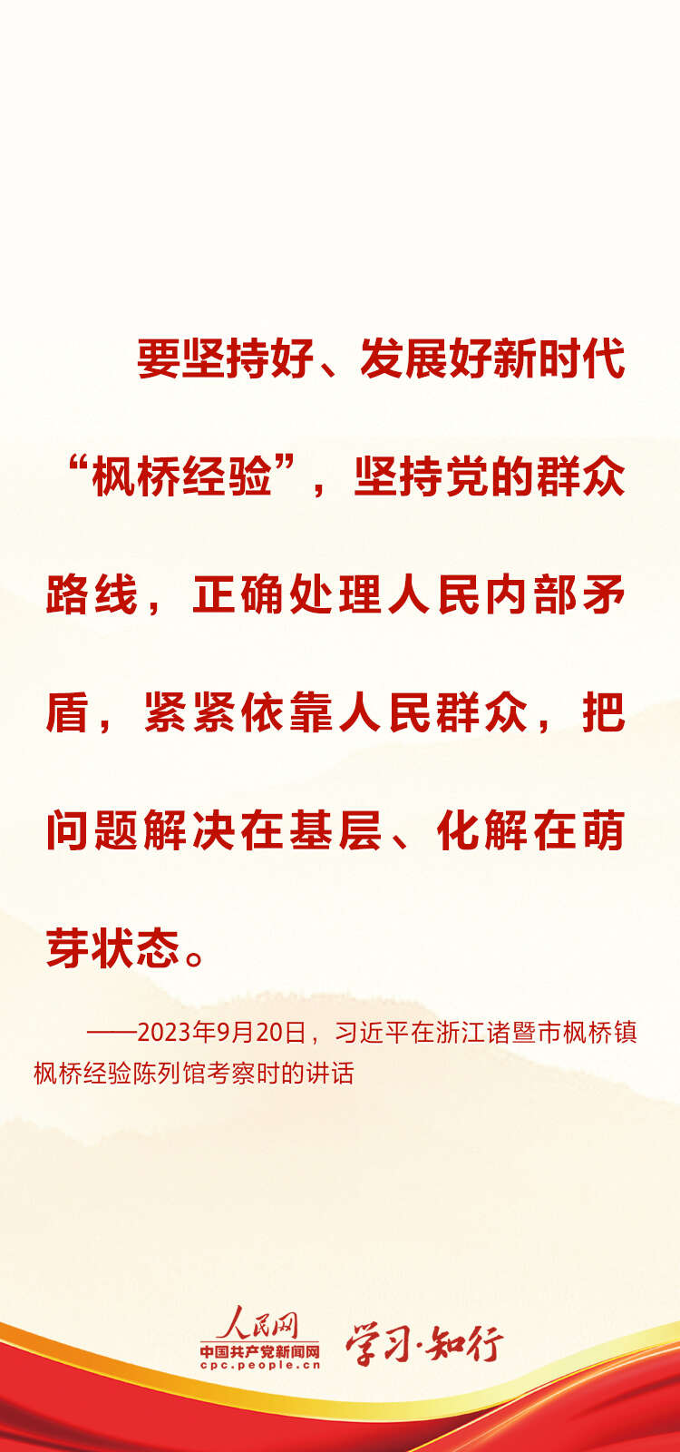 2023年9月20日下午,中共中央总书记、国家主席、中央军委主席习近平来到“枫桥经验”发源地诸暨市枫桥镇,参观枫桥经验陈列馆,了解新时代“枫桥经验”的生动实践。