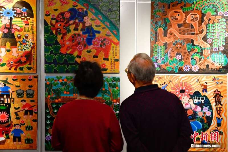 第三届广东省民间文化技艺大师作品展在广州举行,中国民间文艺山花奖得主王汉池创作的农民画作品吸引观众眼球。陈骥旻 摄