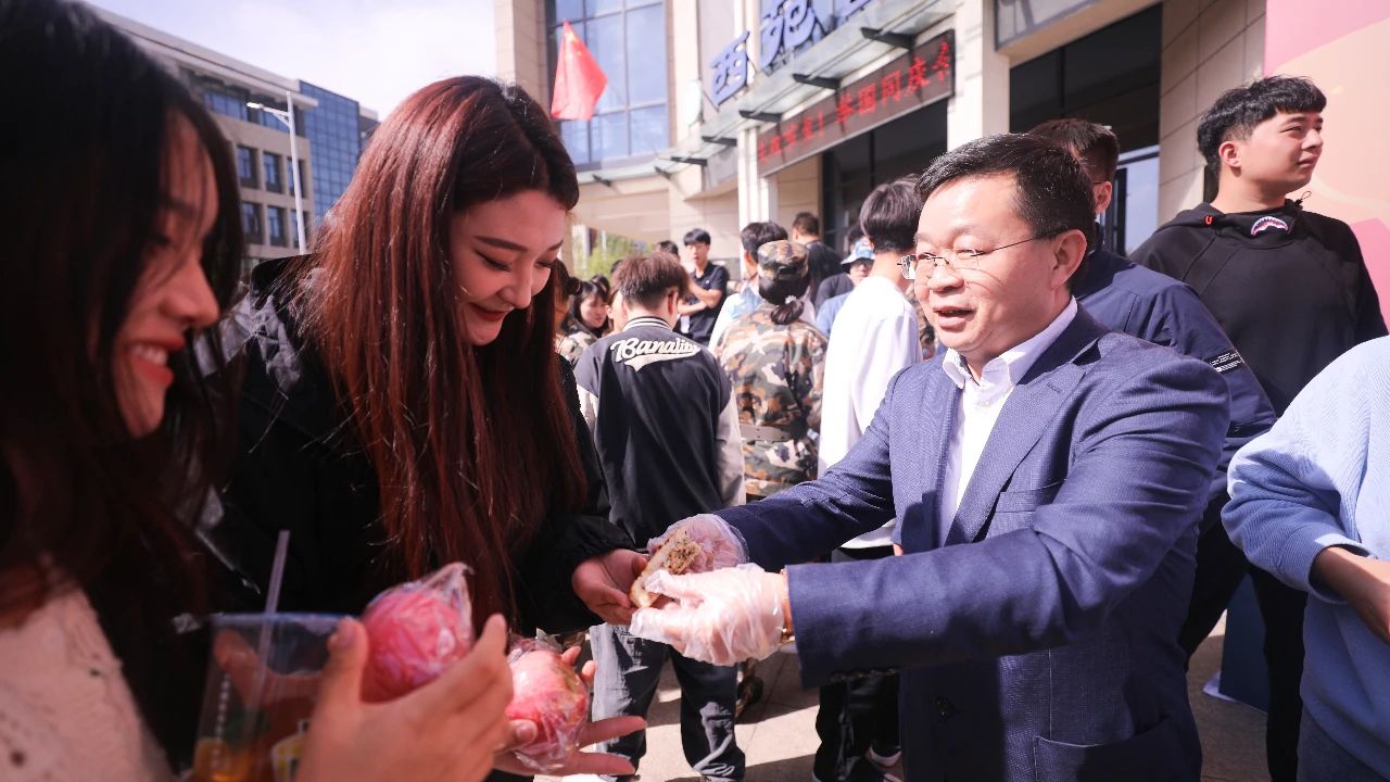 校党委书记、校长李俊杰也来到现场,切月饼、发苹果,与同学们一起共度中秋佳节。