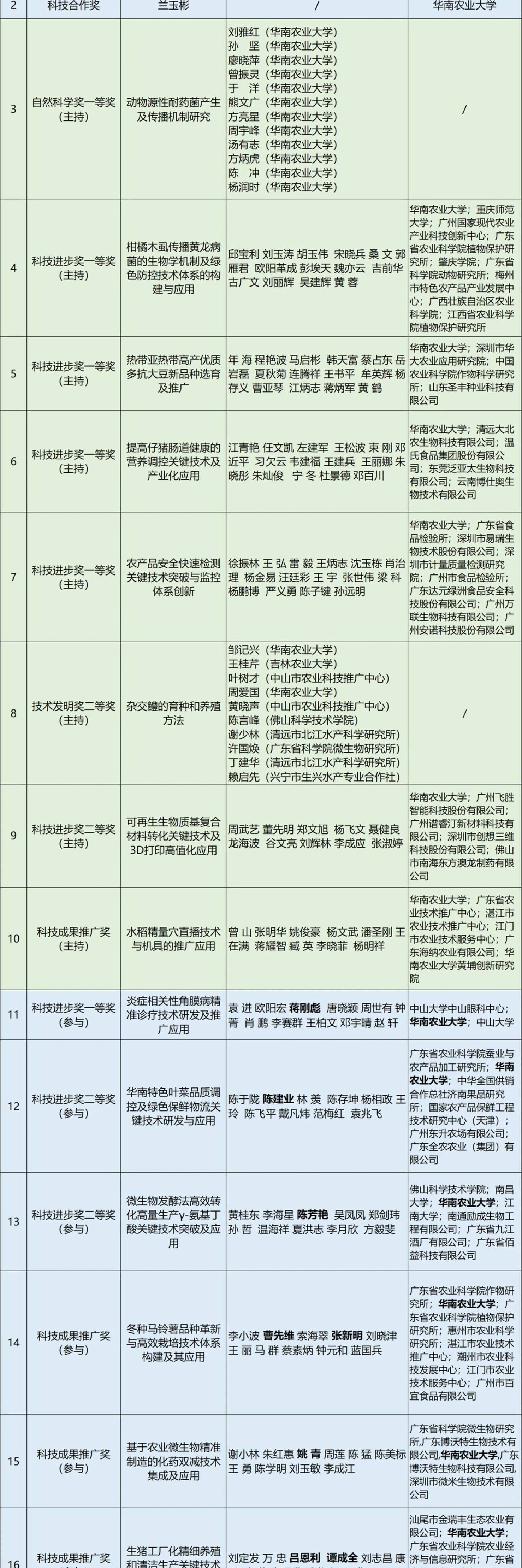 华南农业大学共获16个奖项,其中:
