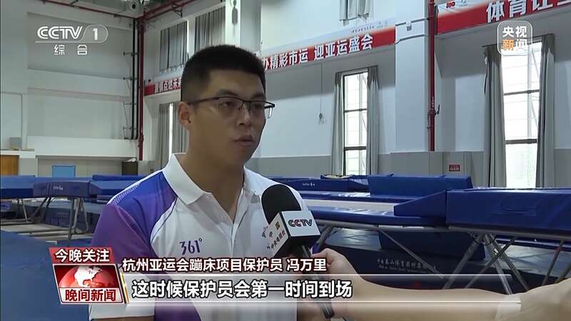 杭州亚运会蹦床项目保护员 冯万里:比如说运动员要滚下网面的时候,这时候保护员会第一时间到场,把运动员缓冲和保护,让他安全着陆。所以我们会非常关注运动员在上面的细微表现,第一时间就会做出判断。