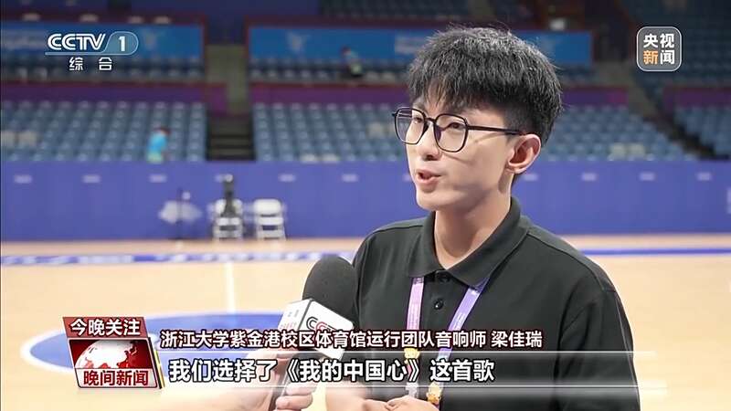 浙江大学紫金港校区体育馆运行团队音响师 梁佳瑞:我们选择了《我的中国心》这首歌,同时我们选择的是童声合唱的版本,因为孩子的声音是最纯洁最真挚的。我们想用最纯洁最真挚的声音去打动双方球队,打动现场所有的观众 。
