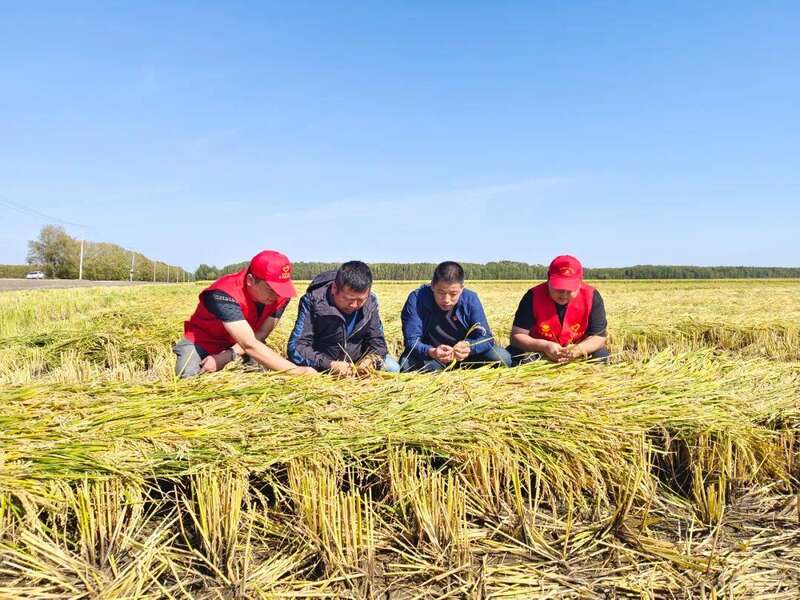 受台风天气影响,北大荒个别地块水稻倒伏,北大荒集团江滨农场有限公司团委组织青年助农服务团志愿者,深入田间地头,帮助种植户对倒伏水稻进行人工割晒。