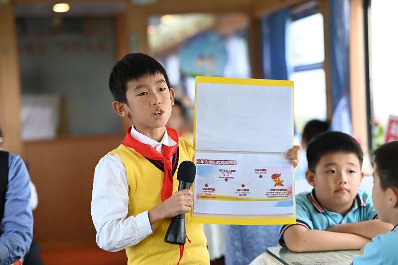 “几十年的风雨历程,中国少年先锋队始终跟随中国共产党,与祖国同呼吸、共命运。”10月11日上午,“红领巾号”列车校外辅导员杨隽雯在列车“文化长廊”前,向一旁驻足的少先队员图文并茂地介绍少先队的光荣历程和“红领巾号”列车的故事。