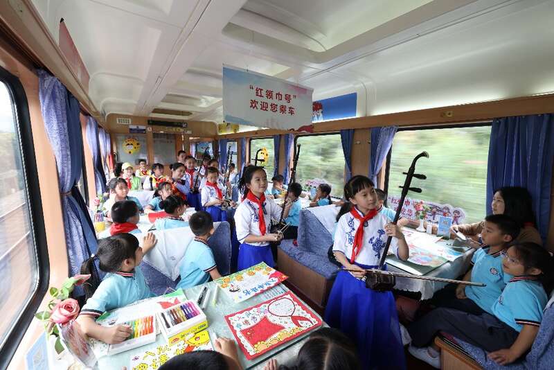 一曲《闪闪的红星》在车厢缓缓奏响,少先队员们手持二胡,熟练地拉着弓弦,队歌《我们是共产主义接班人》响起,少先队员们更是现场表演起了快闪,嘹亮的歌声在车厢内久久回荡。