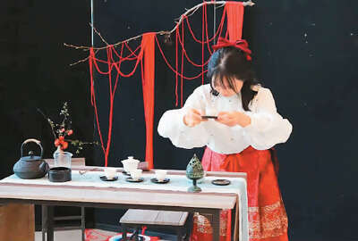 毛聆玲在艺术展活动中表演茶艺。