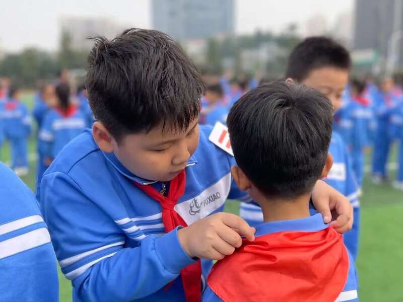 济宁学院附属小学纪念建队74周年主题队日活动暨2022级入队仪式上,第三大队队员为新队员佩戴红领巾。 共青团山东省委供图
