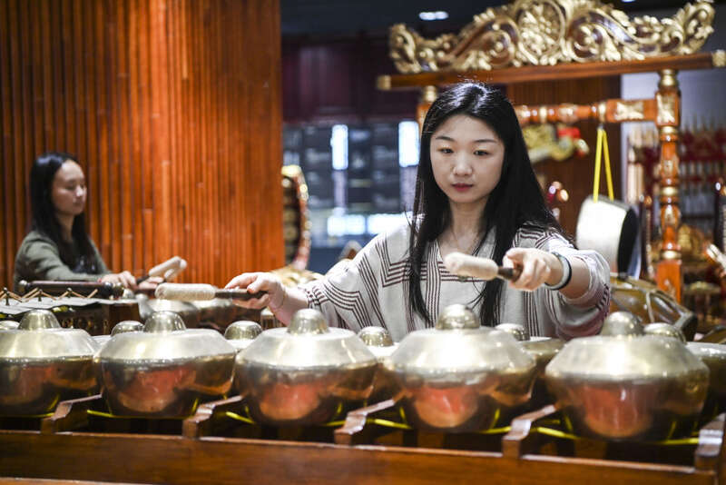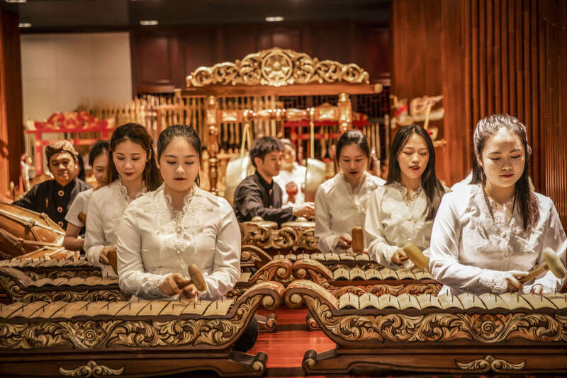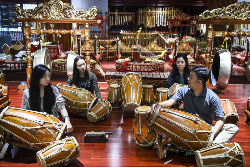 ↑10月12日,在广西艺术学院,仁迪的学生在练习甘美兰。