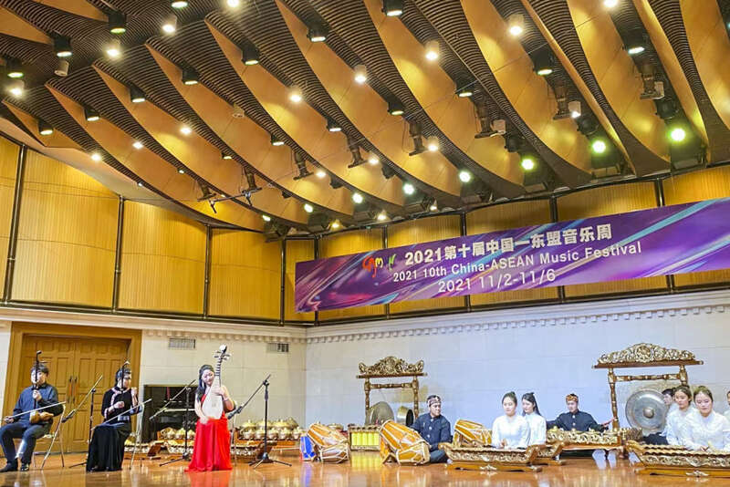 ↑仁迪(左四)带领乐团成员在第十届中国—东盟音乐周上演出(2021年11月3日摄)。新华社发