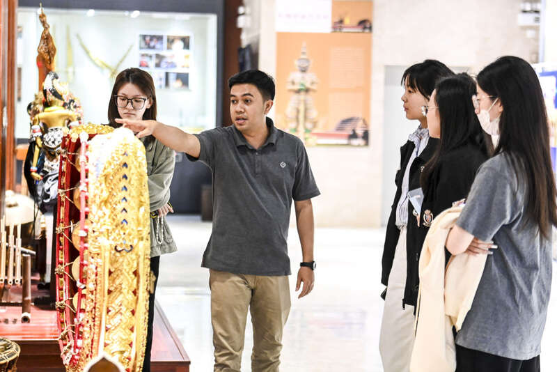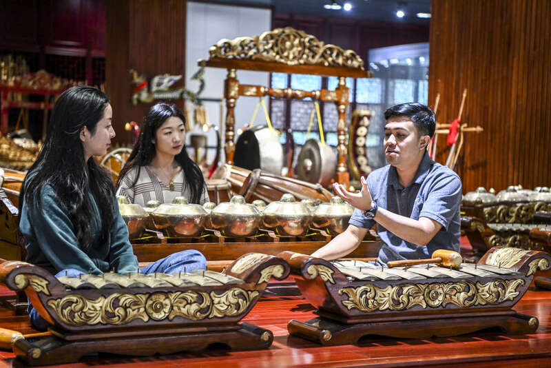 ↑10月12日,在广西艺术学院,仁迪(左二)为学生讲解甘美兰知识。