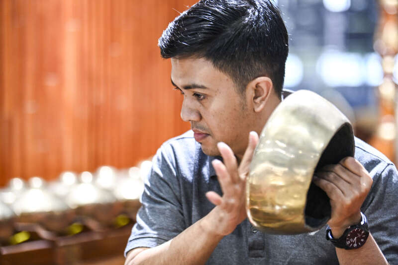 ↑10月12日,在广西艺术学院,仁迪在展示甘美兰组成部分之一的金属排琴。