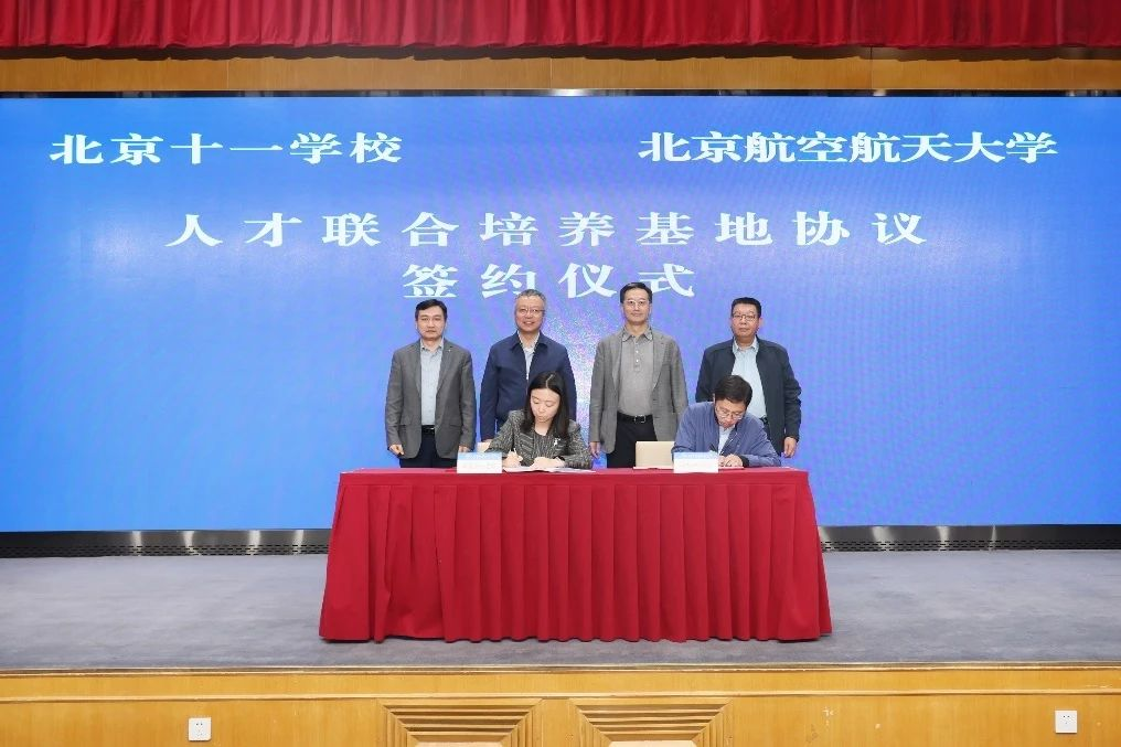 北航研究生院副院长吴江浩和十一学校校务委员、教导处主任朱兰代表双方学校签署“北京航空航天大学——北京十一学校人才联合培养基地协议”。双方本着“优势互补、合作共赢、人才共育”的原则,整合各自优势资源,建设人才联合培养基地,以此创新高校与中学联合培养人才模式,探索大中衔接、创新人才贯通培养的路径和机制,打通大中衔接从课程构建、师资交流、资源共享的平台,夯实拔尖创新人才培养基础,提升中小学教师队伍的水平,为服务教育强国战略贡献力量。