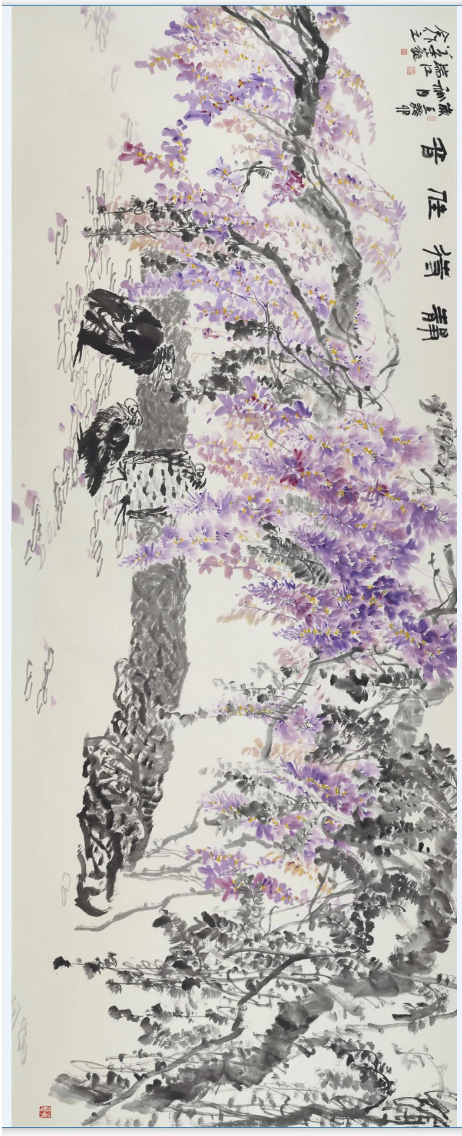《静候佳音》由姚瑞江、姜巍两位画家完成,这幅花鸟作品,以紫藤花为主要表现物象,造型精准,笔墨鲜活生动,花藤的走势内有韵律,灿烂繁华,迎风摇曳,惊艳无比,紫藤花下的鸟儿灵动有趣。整幅画面营造了安静祥和之感,同时也寓意着紫气东来,代表着对祖国繁华锦绣和人民吉祥安乐的祝福。