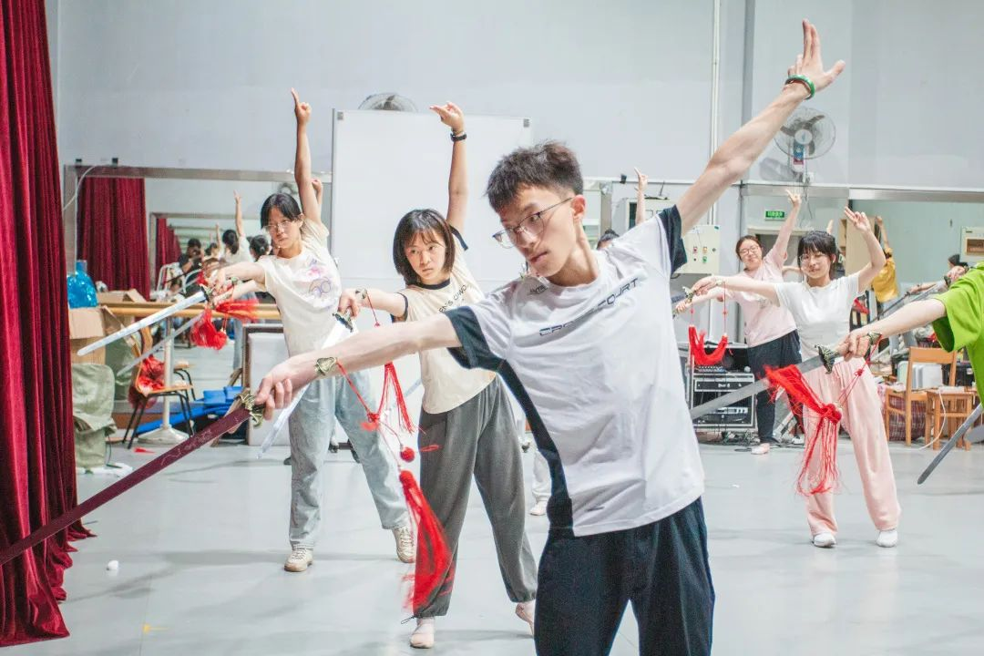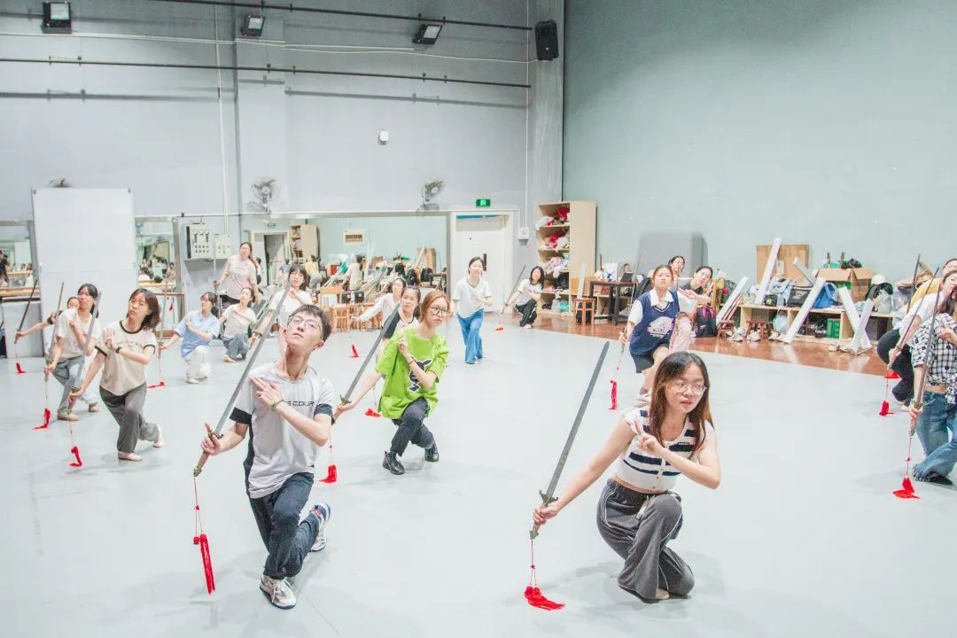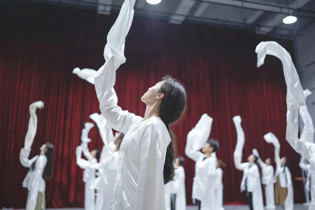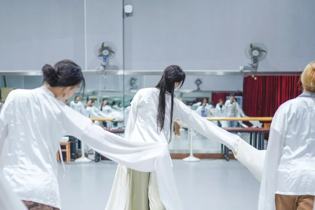 朱月跟同学们强调,落叶是旋飞的,翩翩坠地的过程包含着时间的无限拉长,所以在动作中不仅要表现“旋”“降”,更重要的是拉长时空,这时候刹那的停顿、恍然就显得尤为重要。