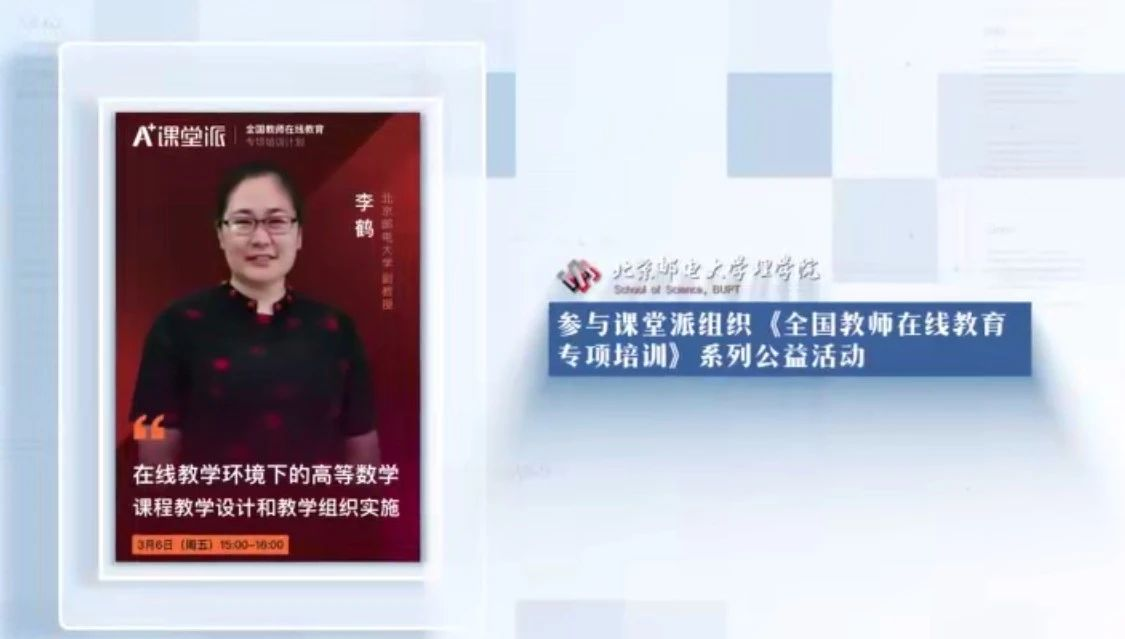 自2017年起,李鹤开始搭建“邮理有李”系列育人平台。包含“邮理有李”微信公众号,“邮理有李” B站直播间,“邮理有李”微信小打卡。最后一次课直播参与最高人数达4487人,弹幕749条,回放次数达1.7万次。更是利用北邮虚拟演播室,首次尝试了5G虚拟直播课《高等数学期末习题课》,助力学生学习;指导理学院“学霸小课堂”建设,构建“学生讲授、老师指导,互动提高,重点传播”的推送形式。搭建理论与实践相结合、育德与育心相结合、课内与课外相结合、线上与线下相结合、解决思想问题与解决实际学习困难相结合的育人体系。