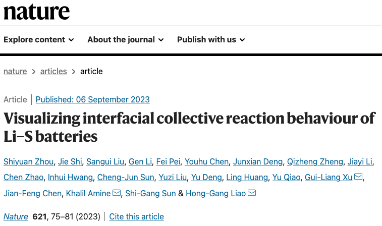 北京时间9月6日23时,国际顶级期刊Nature发表了题为“Visualizing Interfacial Collective Reaction Behaviour of Li-S Batteries”的最新研究成果,该项成果基于自主研发建立的高时空分辨电化学原位液相透射电子显微系统(EC-TEM),对锂硫电池界面反应过程进行了深入研究,首次发现了锂硫电池电荷储存聚集反应新机制。该成果的第一作者正是周诗远。