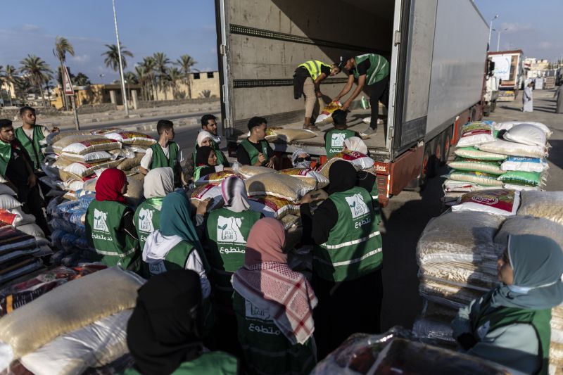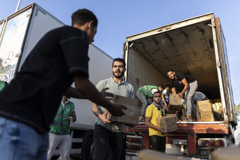 当地时2023年10月16日,埃及北西奈,志愿者将食物和物资装上援助车队的卡车,运往加沙。由埃及非政府组织组织的援助车队今天从开罗出发,前往加沙-埃及边境的拉法。10月7日,巴勒斯坦武装组织哈马斯对以色列南部边境社区发动突然袭击,引发了几十年来巴以冲突中最激烈的一次爆发。以色列发动了大规模的轰炸行动作为报复,并警告即将进行地面入侵。