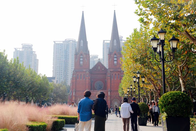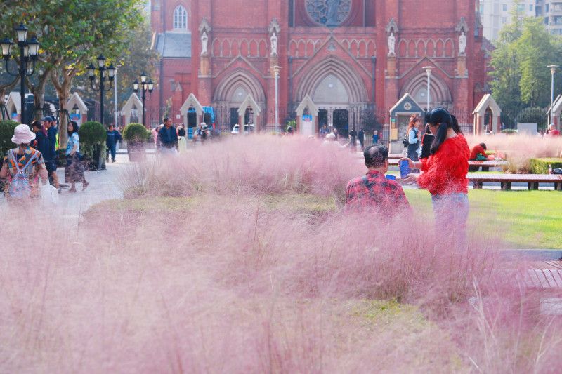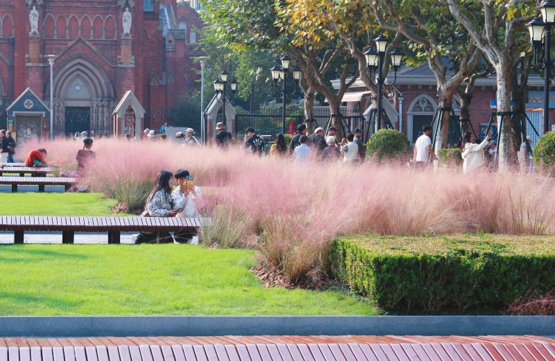 2023年10月17日,上海,粉黛乱子草扮靓徐家汇教堂广场,营造魔都“粉色浪漫地标”,微风中轻盈摇曳的网红花草与历史厚重感的百年建筑在一起相得益彰,吸引众多市民游客驻足欣赏、拍照留影。徐家汇大教堂是中国著名的天主教堂,建筑风格为新古典主义时期哥特复兴式,由英国皇家设计师道尔达(W.M.DOWDALL)为教会设计,表达了天主教神学世界观,体现了空间艺术的感染力量。