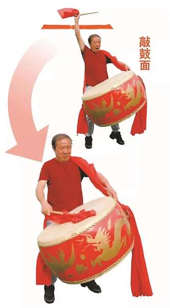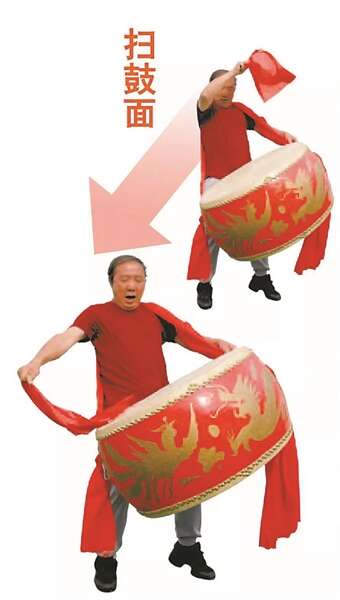 白纸坊挎鼓表演时,铿锵昂扬的鼓点,配合表演者的呼叫呐喊,气势豪迈。演员主要通过变换鼓的敲击位置、力度以及节奏快慢来表现技巧。“比如敲击鼓心,发出的声音浑厚响亮,击打边缘,声音就是清脆短促。”在李双义看来,最富有激情的技艺就是扫鼓法:“用鼓槌横扫鼓面,不光要配合表情动作,击鼓时还要将鼓点中蕴含的情绪表达出来,比如表达进攻,就要沉稳有力、不急不躁;表达胜利,就要轻松欢快一些。”