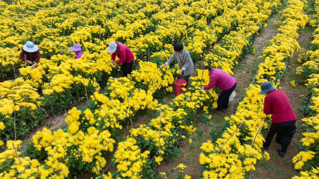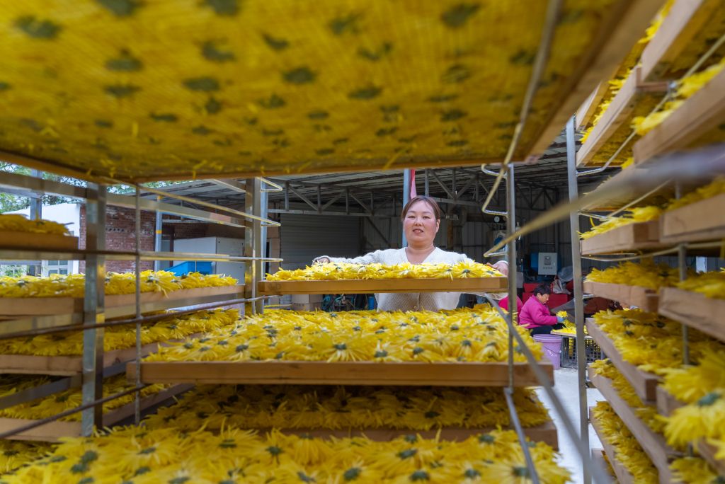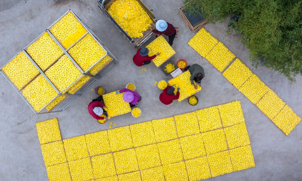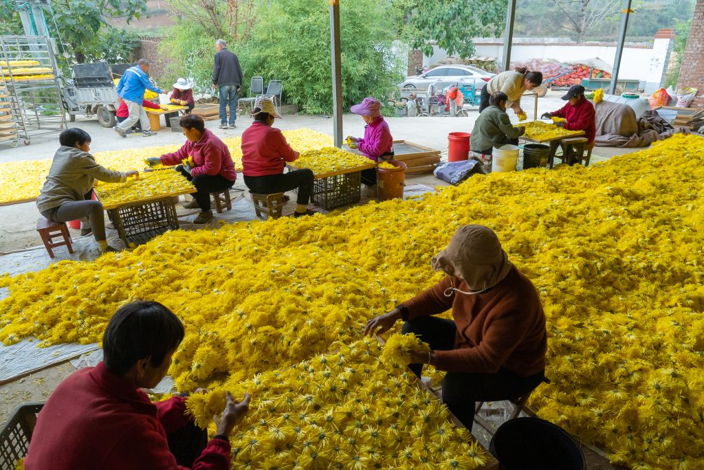 2023年11月3日,河南省洛阳市,宜阳县韩城镇朱家沟村,金灿灿的菊花大面积盛开,村民正在采摘金丝皇菊,并进行摆盘烘干加工,田间地头和工厂车间一派繁忙景象。该村依托自身资源优势大力发展菊花产业,目前已形成幼苗培育、盆摘嫁接、茶饮加工、电商销售等完整产业链条,以产业兴旺助推乡村振兴,带动村民致富。