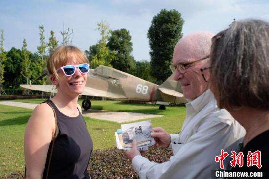 飞虎队老兵及后代在园区看到飞虎队遗址和相关照片、物件,不由睹物思情。美国飞虎队指挥官陈纳德将军的外孙女嘉兰惠,看到祖父的旧照时激动不已,提出要与其旧照合影留念,并表示自己为祖父感到骄傲。图为飞虎队老兵哈里·莫耶(左)与陈纳德将军外孙女嘉兰惠(右)正在参观展馆。