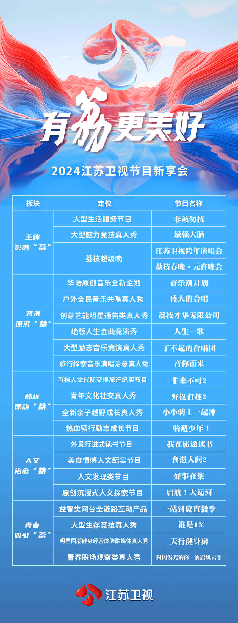 推介会现场介绍,江苏卫视将从四大赛道出发打造20余档节目。其中,音综将是江苏卫视新一年发力的重点。“音浪澎湃荔”赛道以创意性的多元表达,打造荔枝音综矩阵:主打老少对撞反差萌合唱团的《了不起的合唱》、融合“音乐+旅行”的《音你而来》、展现中国原创力量的《音乐潮计划》、联动台网打造千人卡拉OK大事件的《盛大的合唱》、记录一歌一故事的《人生一歌》,以及全新创意艺能通告类真人秀《荔枝才华无限公司》。