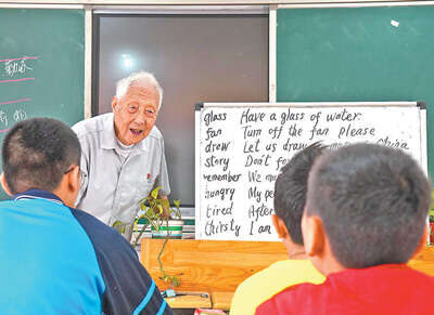 “来,同学们,请跟我一起大声读这个英文单词!”早上8点,铿锵有力的讲课声从教室中传来。很难想象,这位白发苍苍、精神矍铄的老师,已经95岁了。