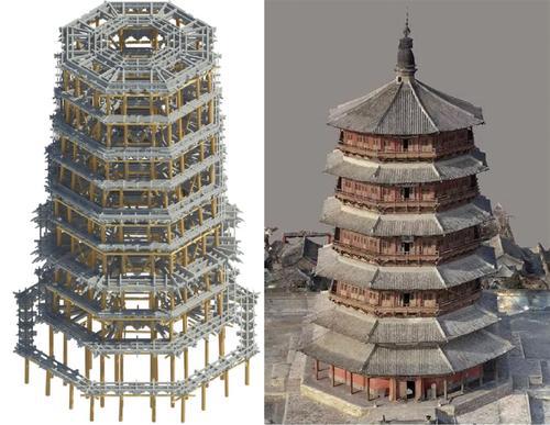 科技架起了一座跨越时间与学科的桥梁。应县木塔是海量的构件组成的复杂体系,牵一发而动全身,想把应县木塔的结构问题算明白,目前最合适的技术是计算机建模数值模拟。