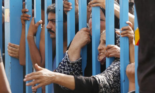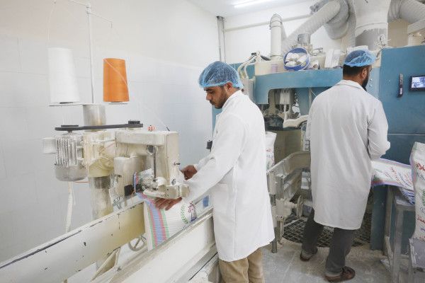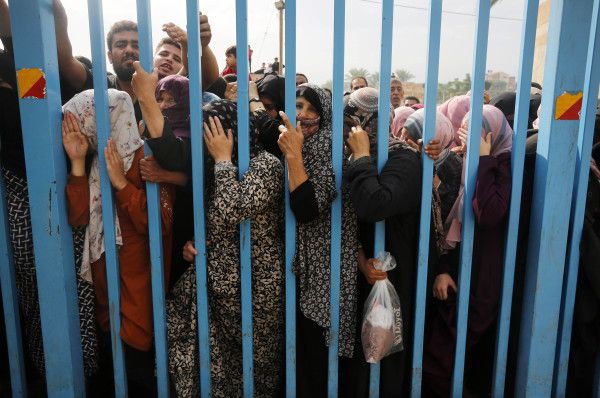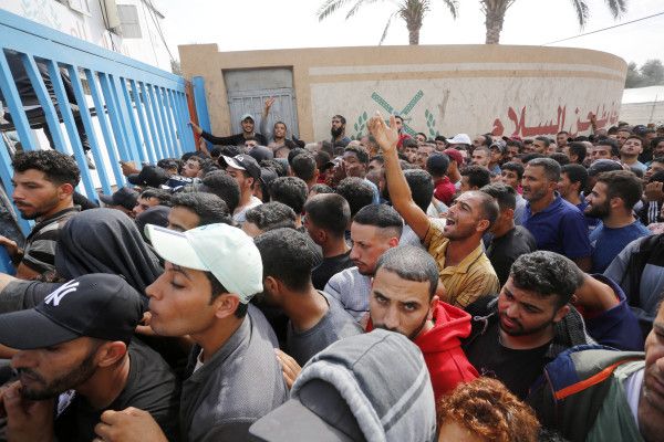 当地时间2023年11月13日,加沙地带代尔拜拉赫,巴以冲突持续38天,市场上的面粉告罄,民众在AL Salam面粉厂前排队购买面粉。面粉厂很难找到燃料来维持发电机的运转。